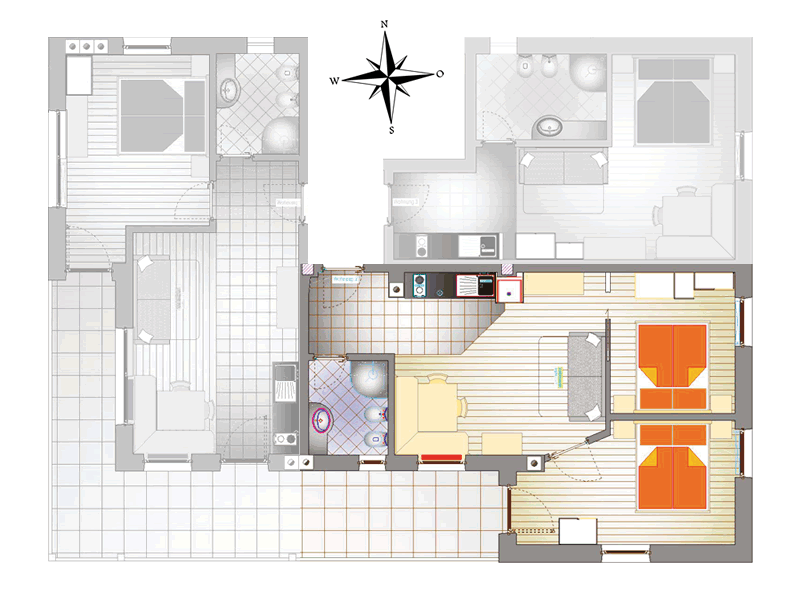 Die Wohnung verfügt über einen großen Südbalkon, zwei Schlafzimmer, eine komplett eingerichtete Küche samt Kühlschrank, Spülmaschine, Couch, Sitzecke sowie Sat-TV, und über ein Badezimmer mit Dusche, WC und Bidet.