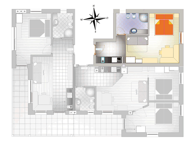 Ihr Sonnenbad können Sie auf unserer Liegewiese genießen, welche Ihnen einen herrlichen Rundblick auf den südlichen Teil der Dolomiten bietet. Die Wohnung verfügt über eine komplett ausgestattete Küche mit Kühlschrank, Spülmaschine, Couch, Sitzecke und Sat-TV, sowie ein Badezimmer mit Dusche, Bidet und WC.